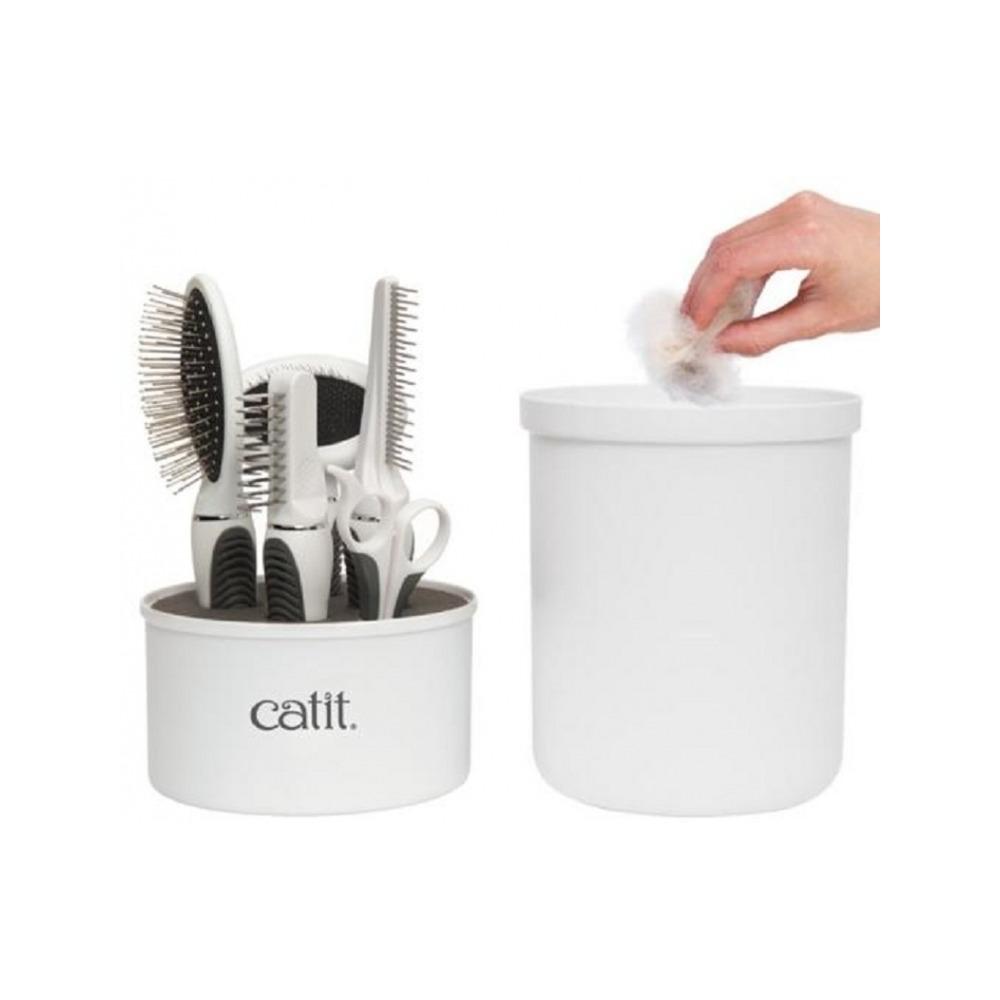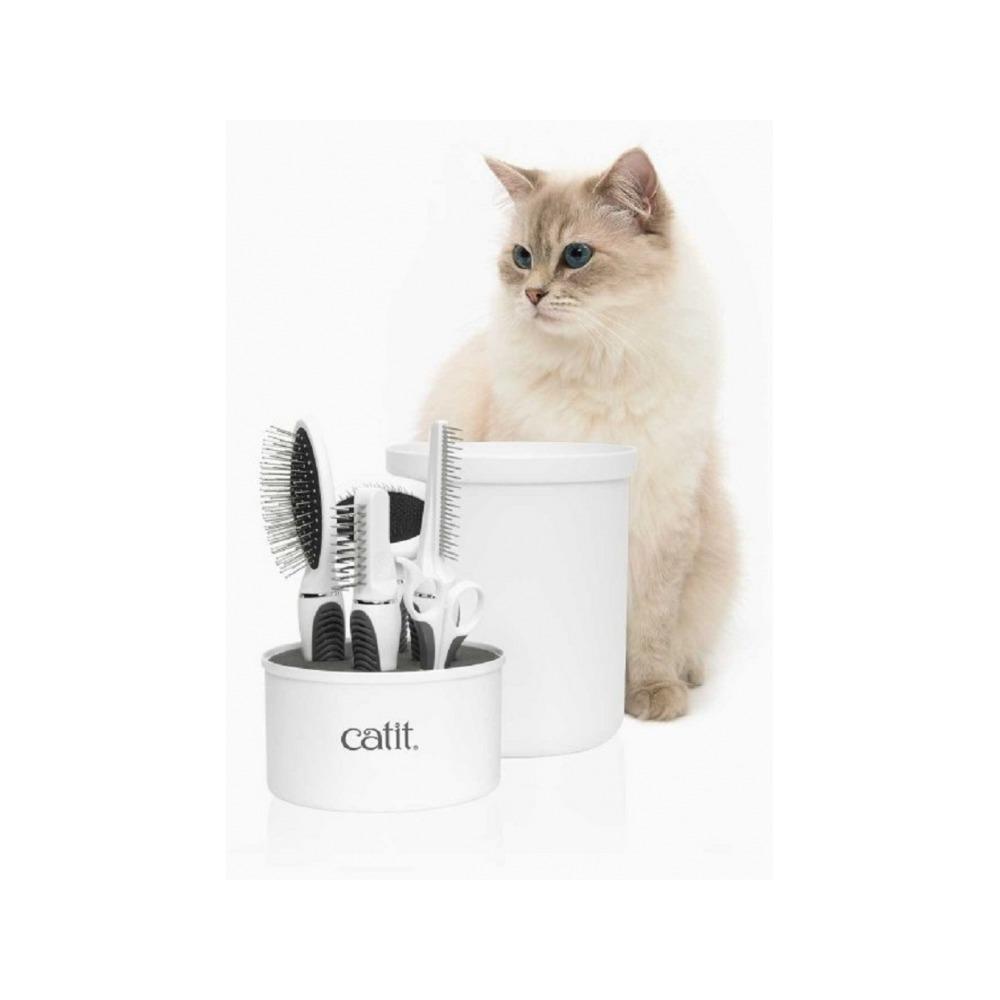 – The Catit Longhair Grooming Kit contains every tool for daily grooming: pin brush, metal slicker brush, long dematter tool, grooming comb with rolling pins, and curved nail clipper