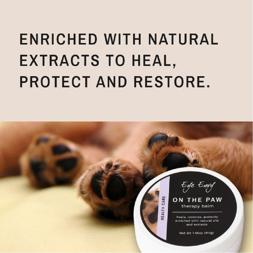 Eye Envy On the Paw Therapy Balm is enriched with natural oils and extracts to heal, protect, and restore your pet’s paw pads. On the Paw Therapy Balm treats pads that have become dry, flaky, and hard with a callous like appearance. Use for: