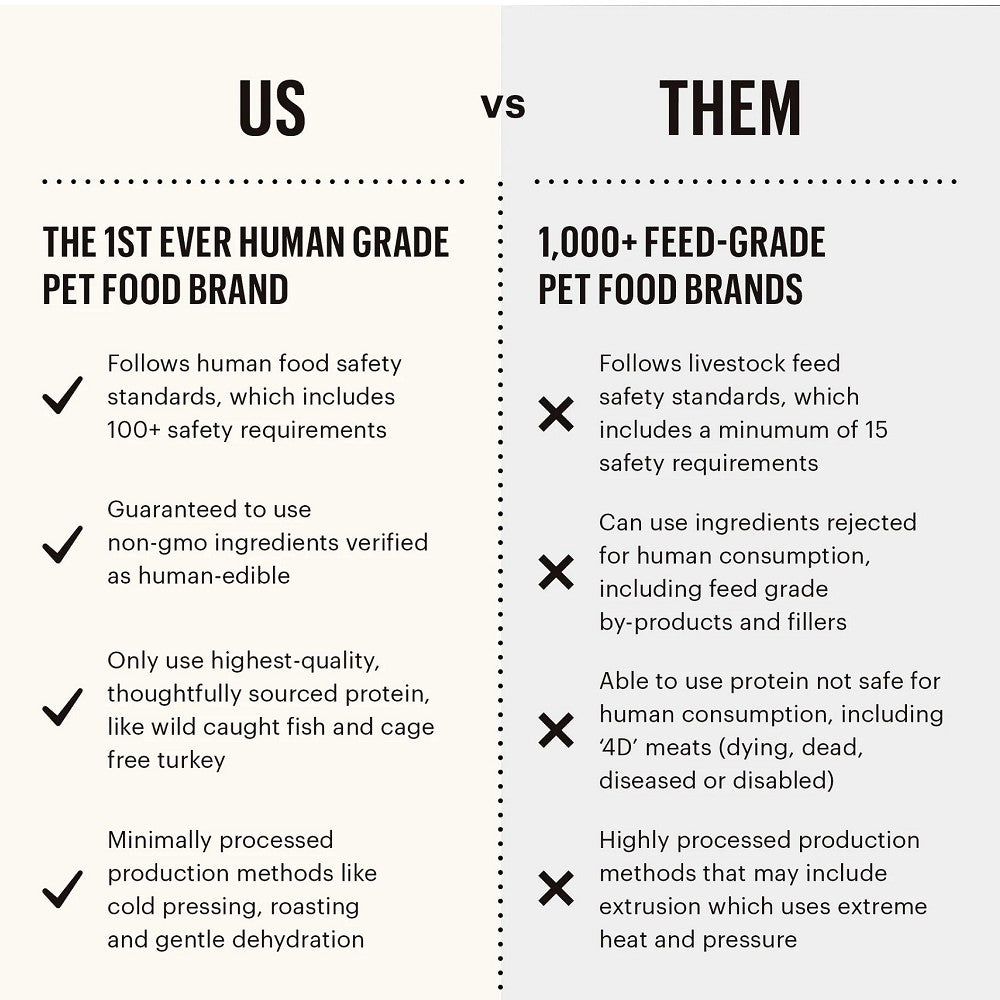 • Unlike most pet food, which is feed grade, this 100% human-grade recipe is made with human-grade ingredients and produced in a human food facility. That means higher quality ingredients and more safety standards, just like you would expect from your own food!