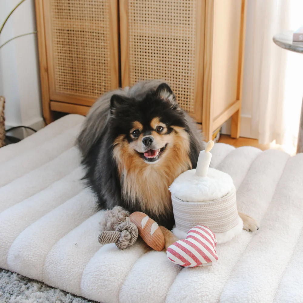 – Includes 4 unique mini toys: silent NOU®, squeaky baguette, squeaky furry pop, and treat-pocket heart.