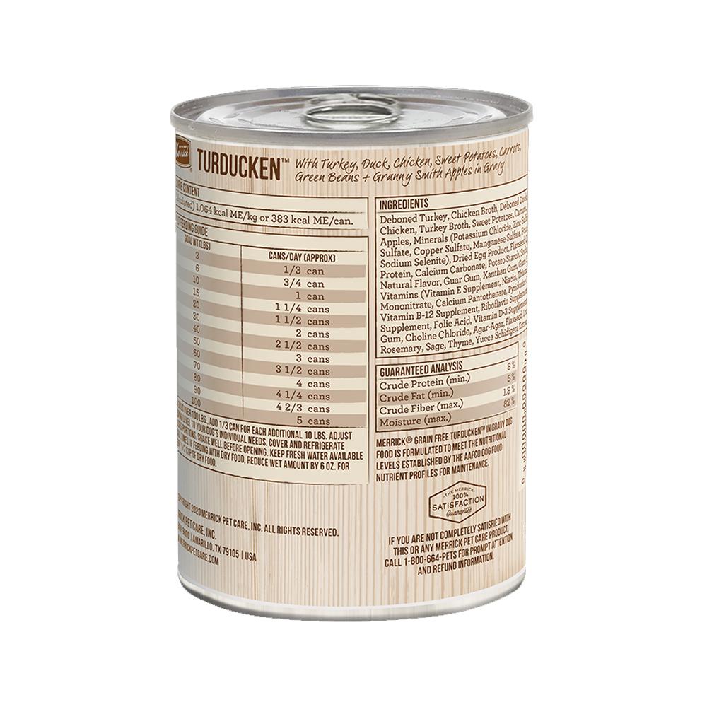 Merrick Turducken Canned Dog Food is a delicious combination of turkey, duck and chicken all cooked together in their wonderful juices that will make even your mouth water. This grain free recipe has sweet potatoes, carrots, green beans and granny smith apples all in a gravy that your dog is sure to love. All Merrick canned recipes can be served as a topper for dry kibble or a nutritious standalone meal.