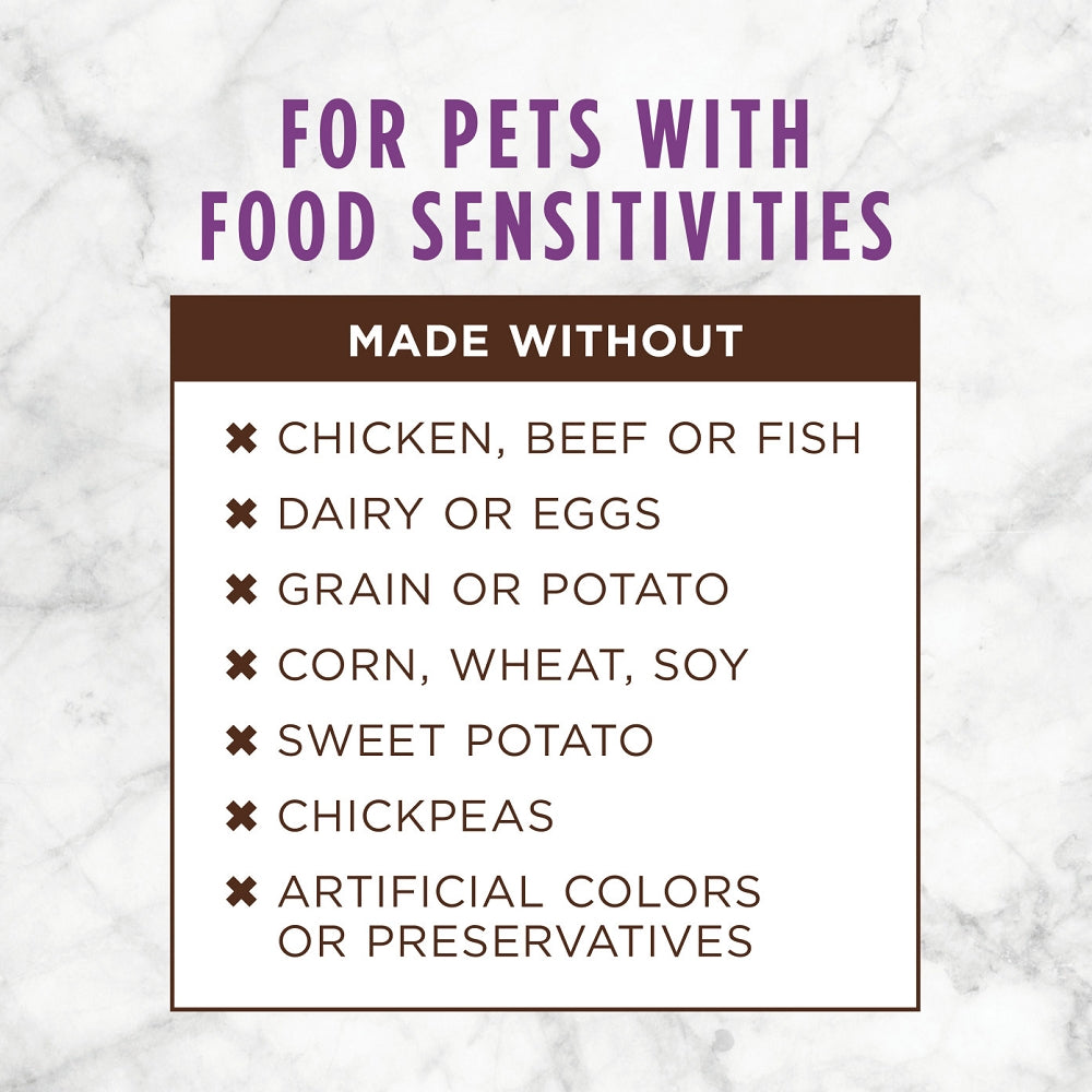 • Purposefully simple ingredient list for pets with food sensitivities – ONE ANIMAL PROTEIN and ONE VEGETABLE
