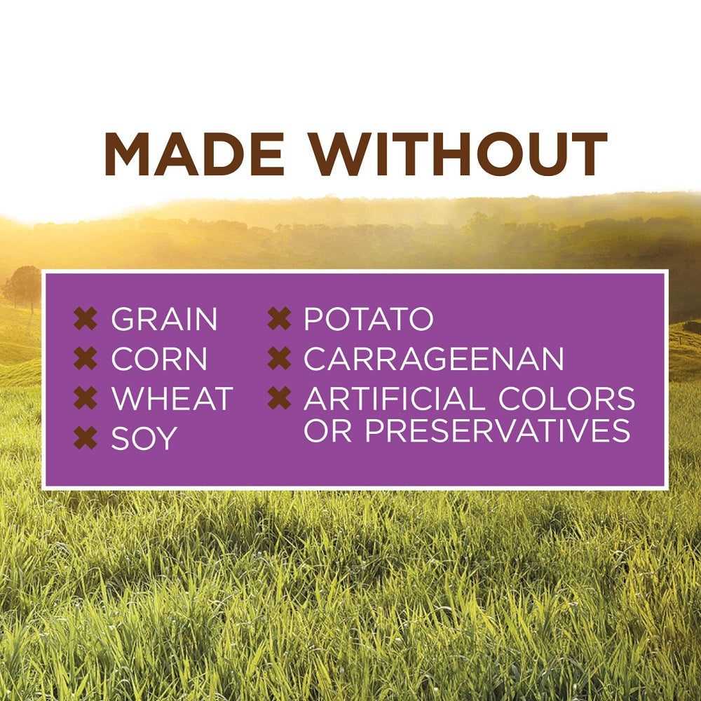 • Made without – grain, potato, corn, wheat, soy, by-product meal, artificial colors or preservatives