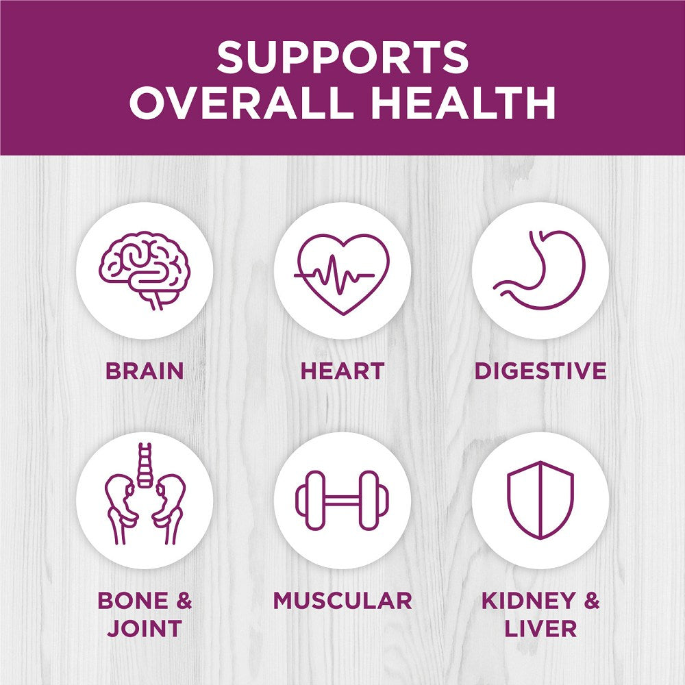 • Liver support through choline, B vitamins, and trace minerals and kidney support from fish oil