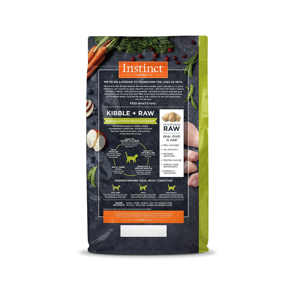 • Cage-free chicken is the first ingredient so it’s packed with animal protein for strong, lean muscles—for 25% less fat and • 15% fewer calories than Instinct Raw Boost