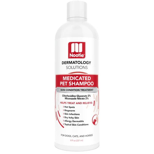 Nootie Medicated Antimicrobial Shampoo is formulated to help relieve and heal symptoms due to skin infections caused by bacteria, fungi, and yeast. Ideal for pets with ringworm and dermatitis, it also helps prevent hot spots if used early on flea bite dermatitis. Delicately formulated with our Soft Lily Passion fragrance, leaving your pet’s coat shiny, soft and smelling great!