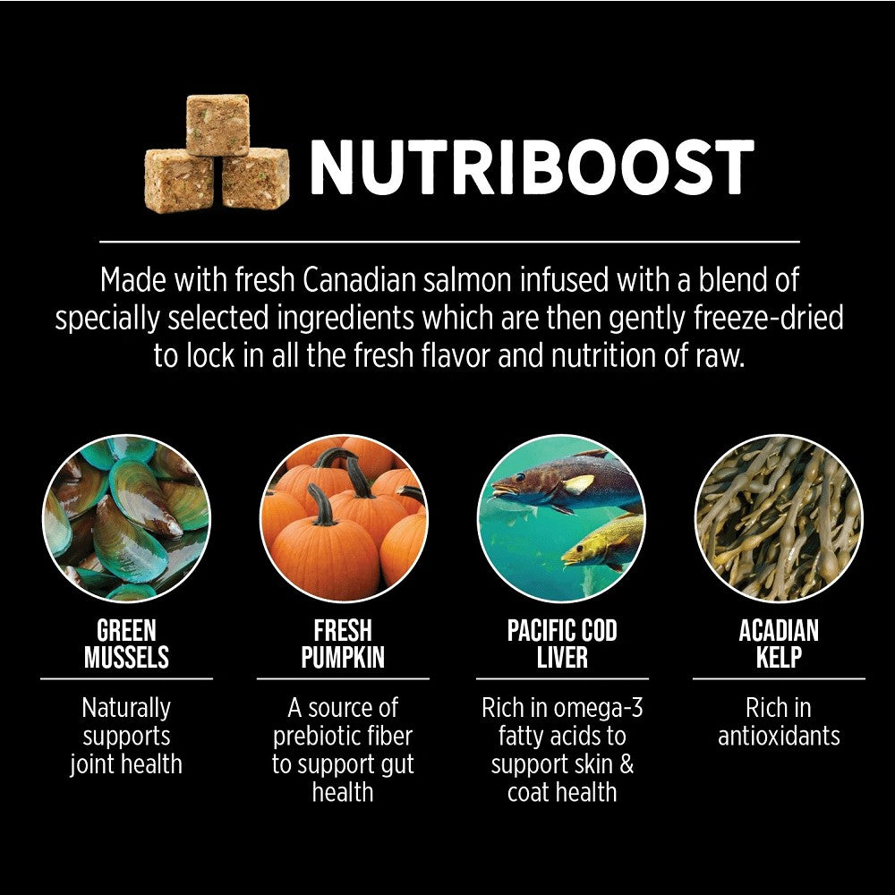 • Nutriboost Freeze-Dried Raw – Fresh chicken is infused with green mussels, pacific cod liver, pumpkin and Acadian kelp, and then gently freeze-dried to lock in the natural goodness of raw, providing superior flavor and promoting optimal health.