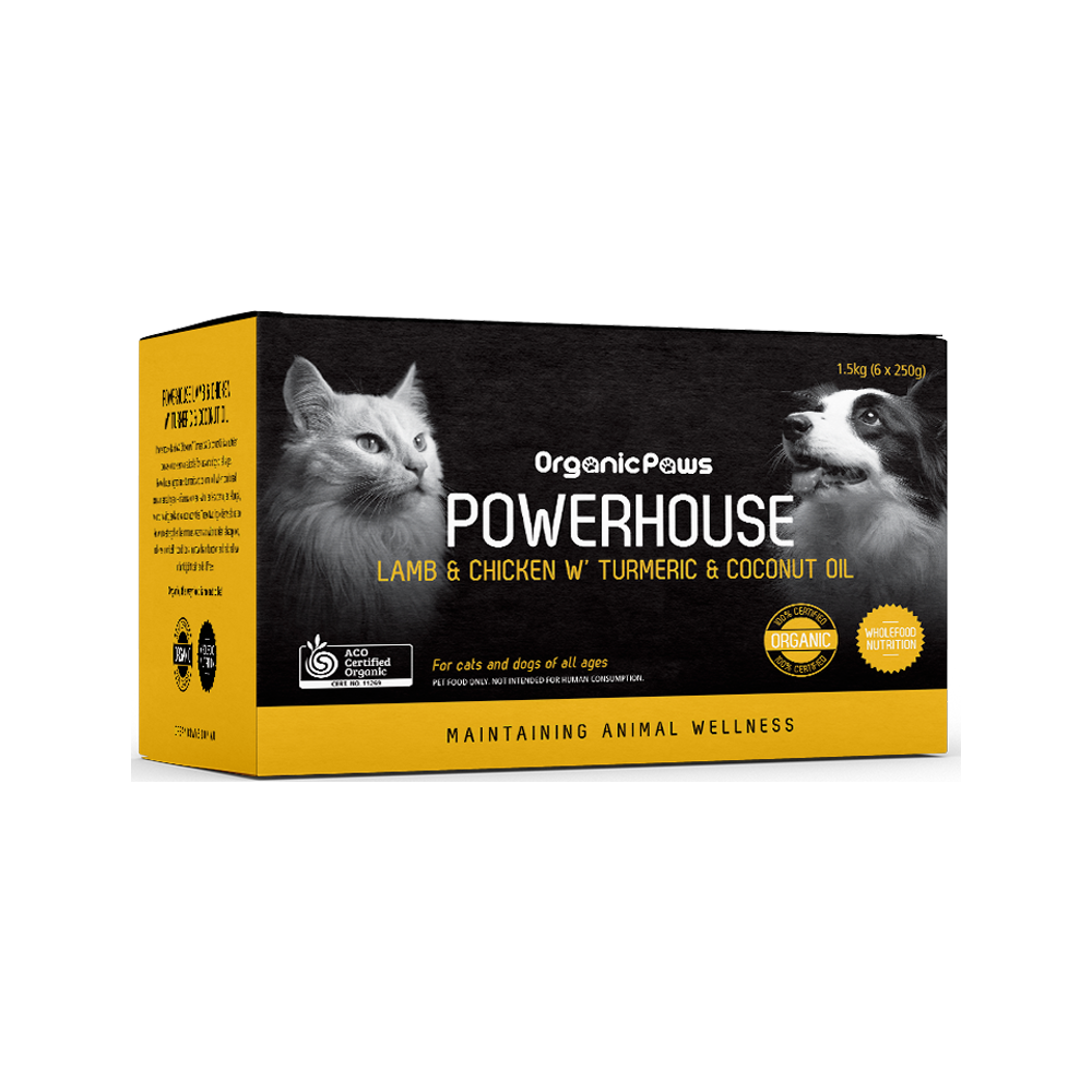 *Made with Certified Organic meats, ground bone and organs including green tripe, each Organic Paws recipe is complete to simulate a carnivore’s natural diet. Using “whole” carcasses including whole chickens and all prime cuts ie. porterhouse, sirloin, topside steak and rumps etc. ensures only nutritious quality muscle meat is used with no fatty trim or off cuts. Cod Liver Oil and Kelp are also added to each recipe in balanced quantities, both well known and documented for their overall and powerful health benefits.