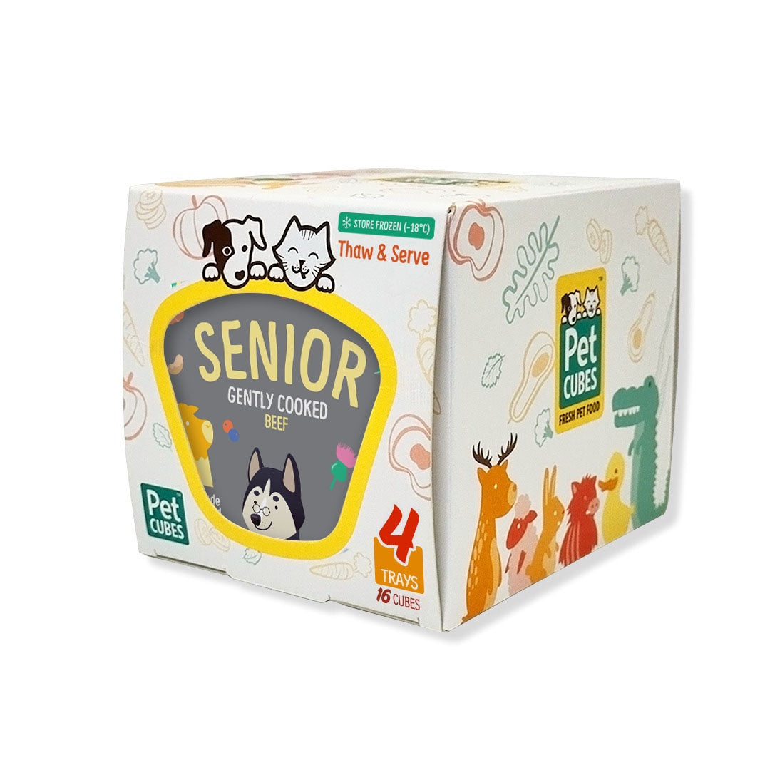 PetCubes Senior Beef is a gently cooked diet prepared at 80˚C. A special formulation by Dr Cabana, this diet is optimised for dogs 7 years old and up. Senior dogs have a unique set of nutrient requirements and this formulation aims squarely at fortifying Buddy Sr’s health.
