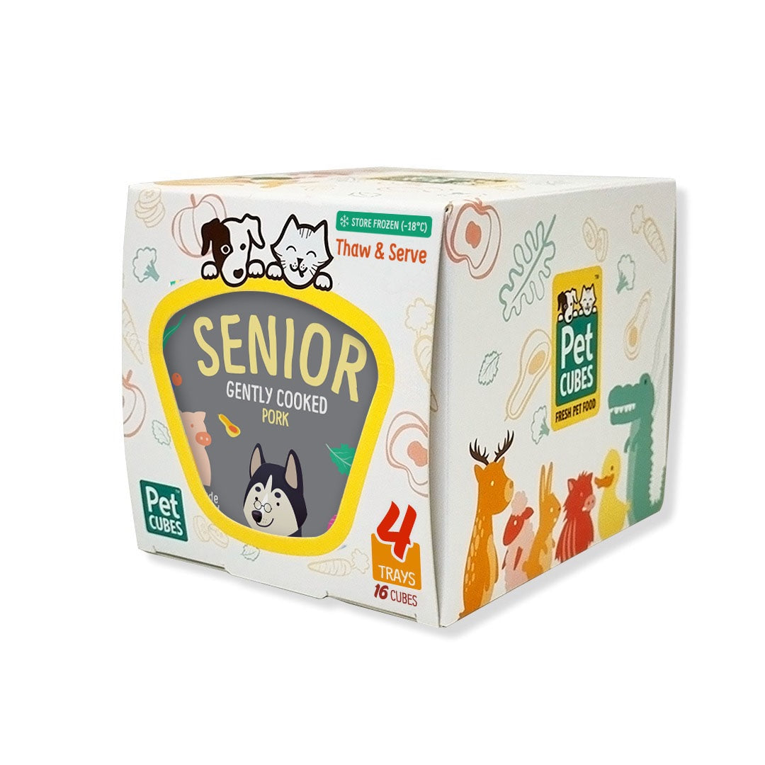 PetCubes Senior Pork is a gently cooked diet prepared at 80˚C. A special formulation by Dr Cabana, this diet is optimised for dogs 7 years old and up. Senior dogs have a unique set of nutrient requirements and this formulation aims squarely at fortifying Buddy Sr’s health.