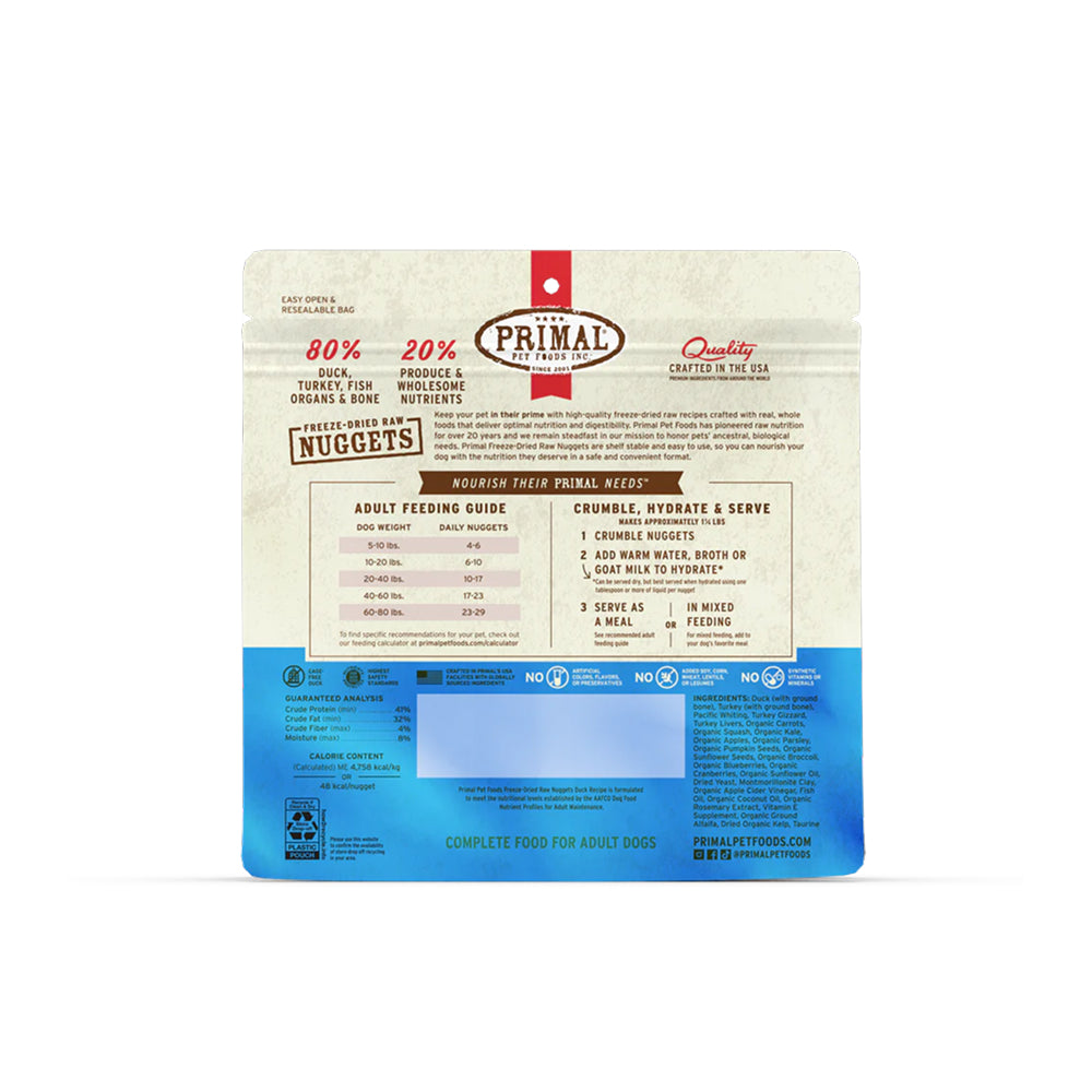 – Freeze-dried nuggets with cage-free duck, turkey & wild-caught fish.