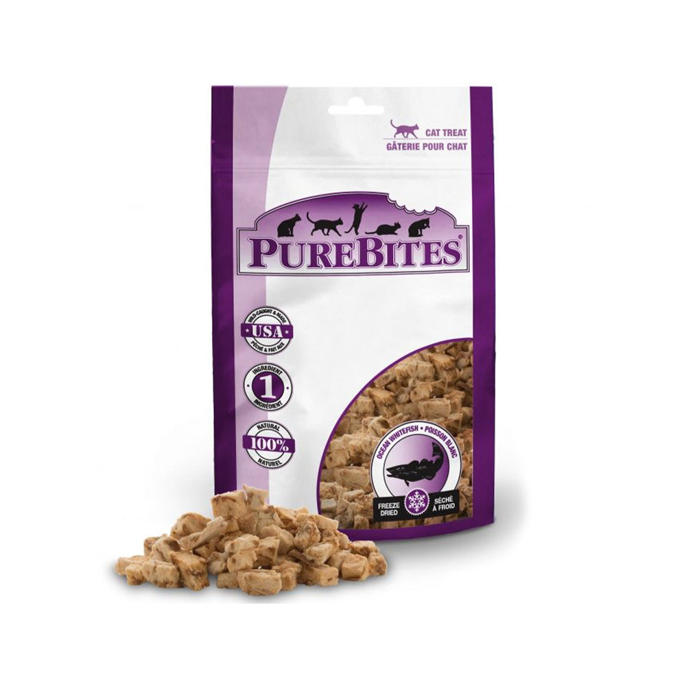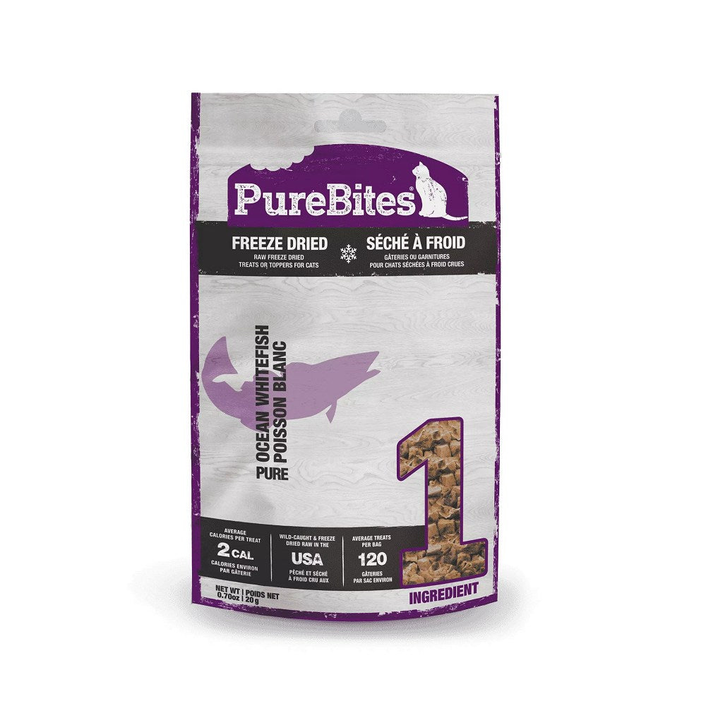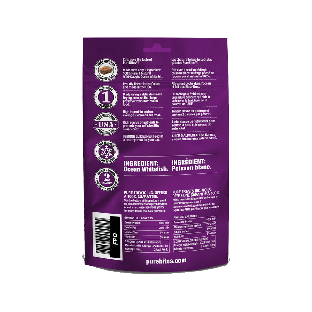 At PureBites, we’re always asking pet parents to “Go ahead, look at our ingredients”. PureBites RAW freeze-dried ocean whitefish cat treats are the ultimate high-value limited ingredient treat or topper. Made with only 1 simple human-grade ingredient you can read, pronounce, and trust: 100% pure wild-caught ocean whitefish. Nothing else. No artificial colors, fillers, or sweeteners. Proudly sourced and made in the USA using a delicate freeze-drying process that helps preserve fresh RAW whole food, locking in the taste cats crave and the high protein / low-calorie nutrition that pet parents love. Freeze-dried treats are a great compliment to a RAW diet since they retain many of the benefits of RAW without the hassle of refrigeration.