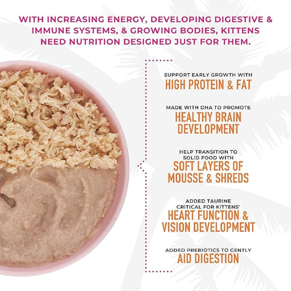 – Delicate layers of mousse & tiny poultry shreds to help baby cats transition from mommy’s milk