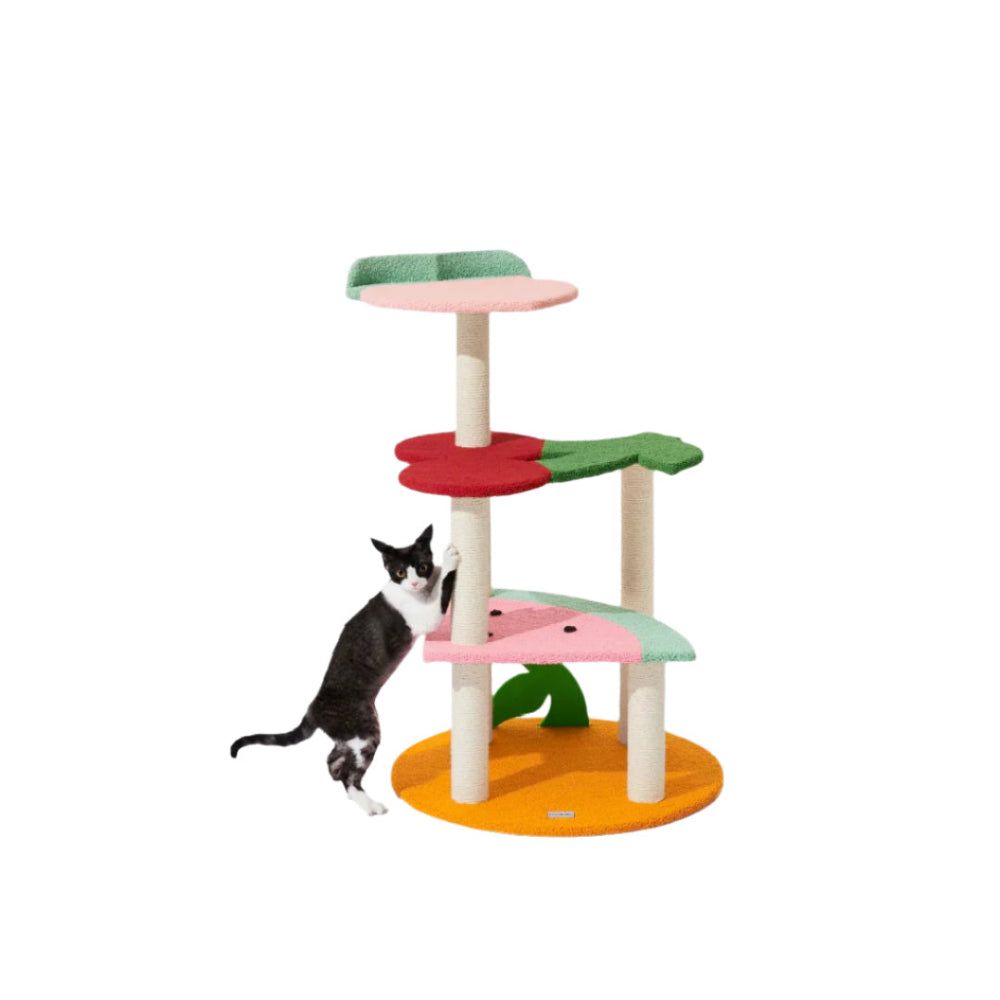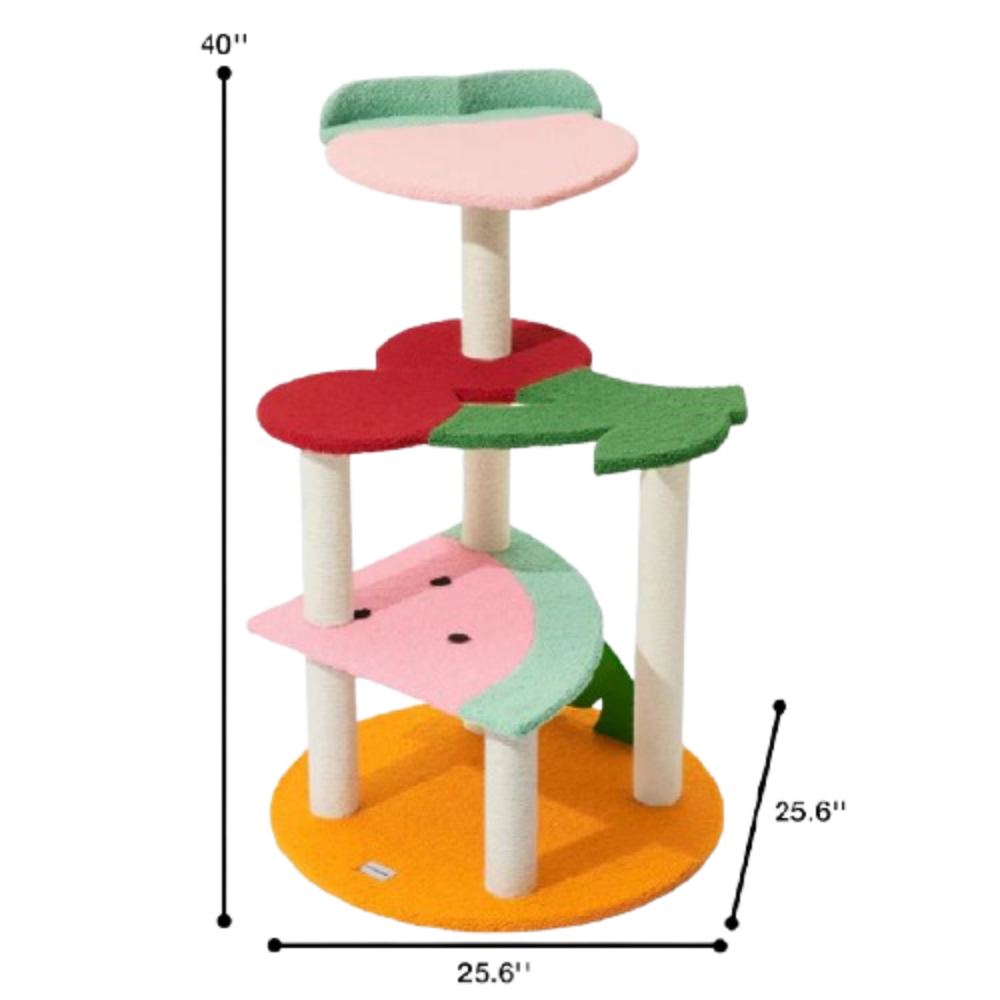 – Bold, fruit-themed cat climber with modern design appeal.