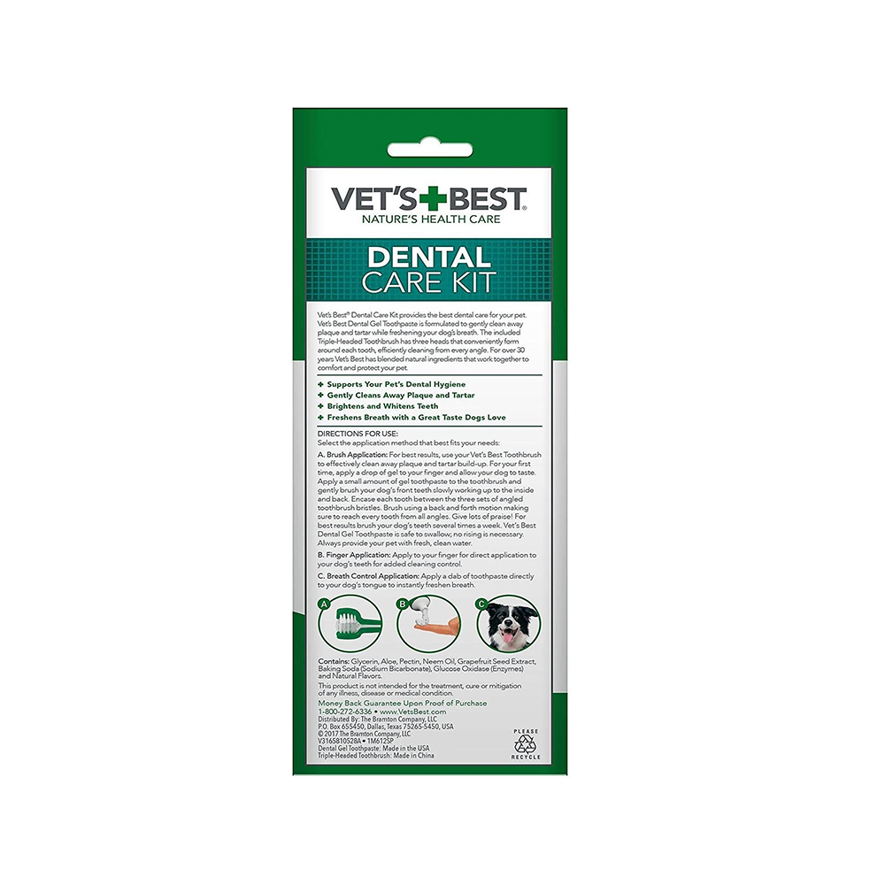 Vet’s Best Dental Care Kit for dogs include a Triple-headed Toothbrush and Dental Gel Toothpaste (3.5 oz.) to support your pet’s dental hygiene.
