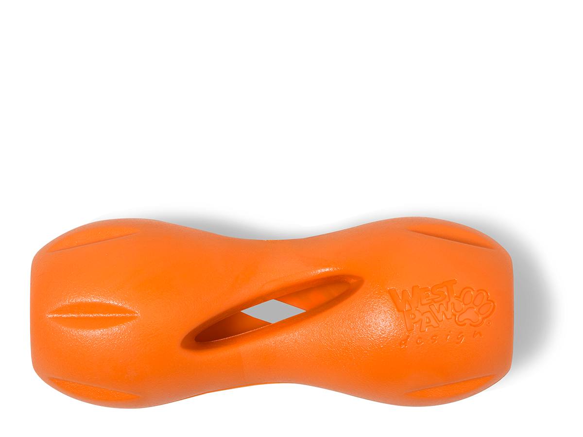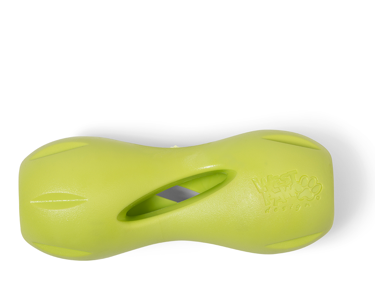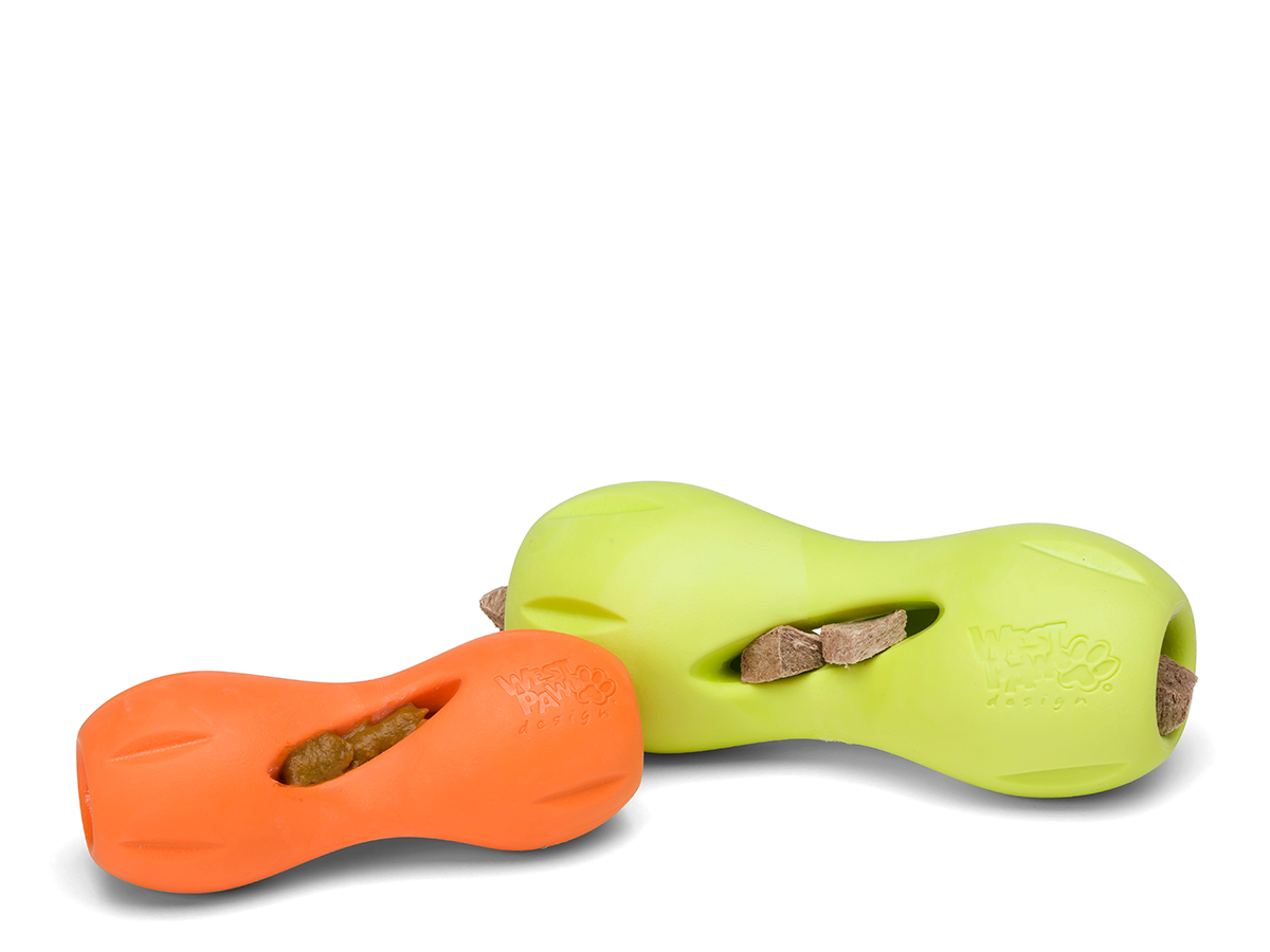 Qwizl is available in two sizes, small and large are available in West Paw’s classic, easy-to-spot colors, Aqua, Tangerine, and Granny Apple. Like all their Zogoflex dog toys, Qwizl is recyclable, latex-free, BPA-and-phthalate-free, FDA compliant (meaning it’s safe to eat off of)