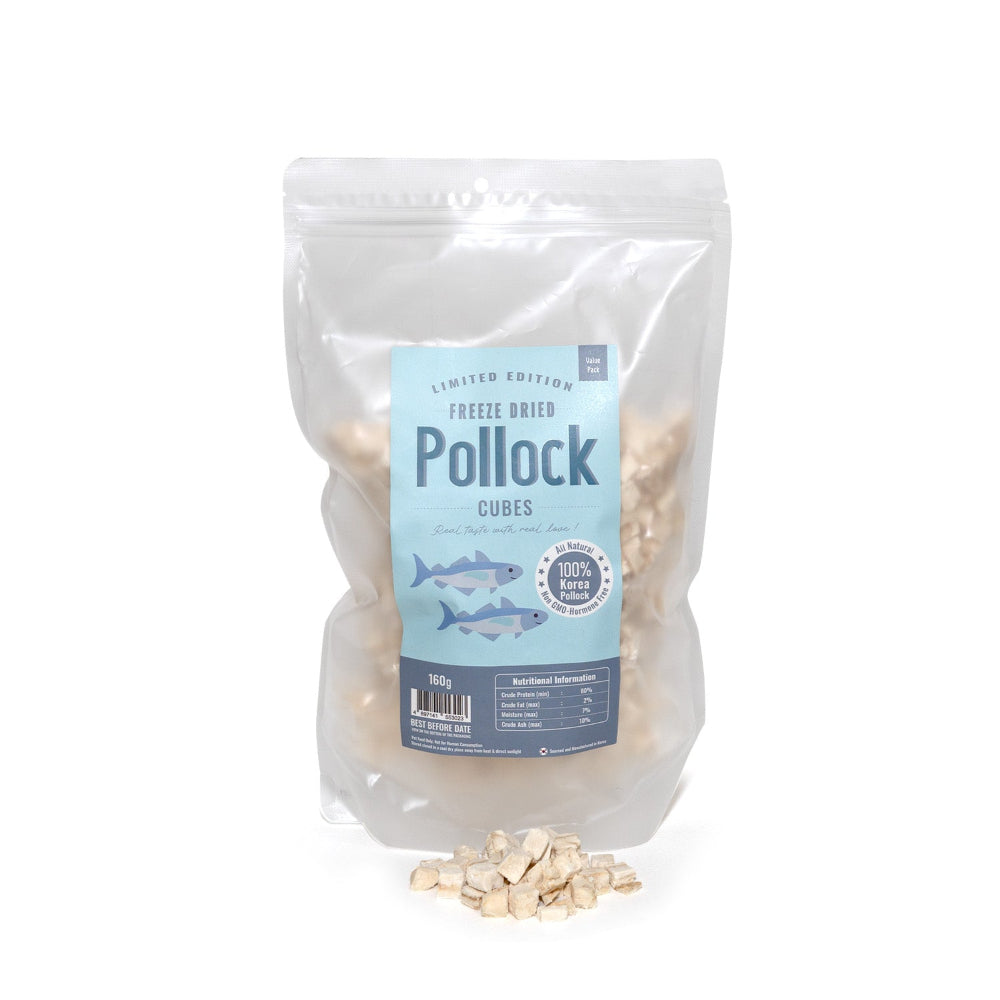 – Freeze-Dried Freshness: the freeze-drying process preserves essential nutrients, flavor, and aroma, ensuring that each cube retains the rich, savory taste of fresh pollock.